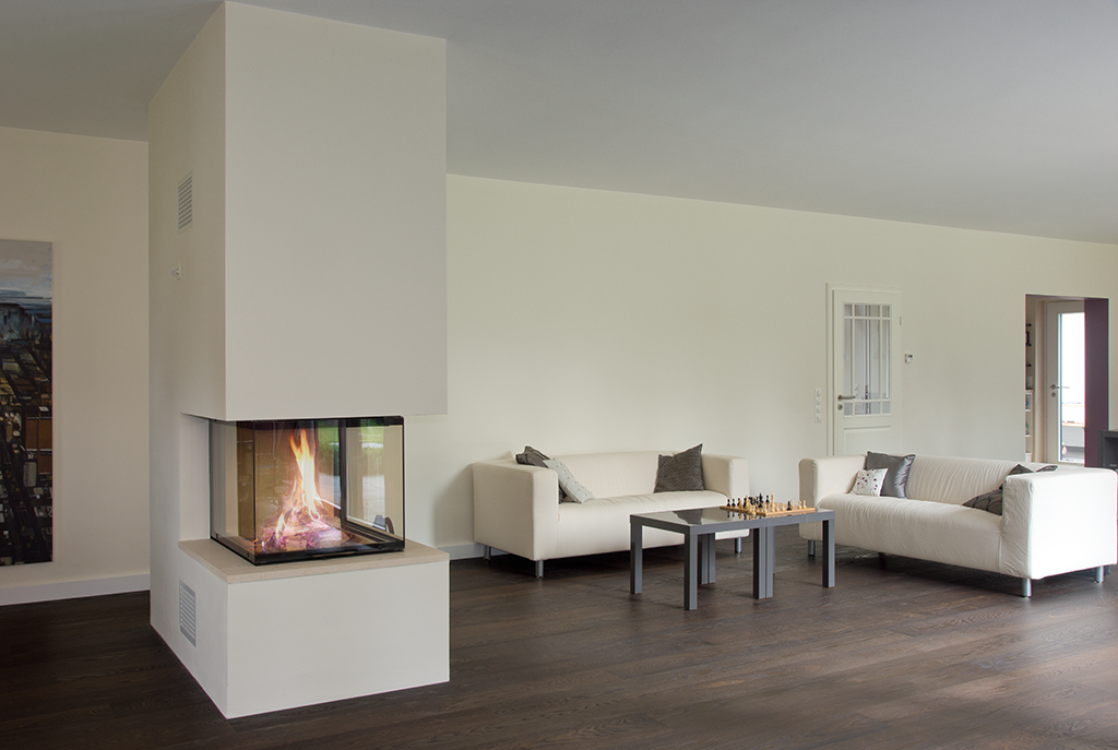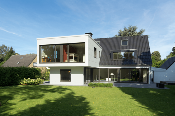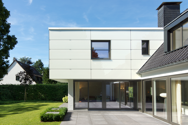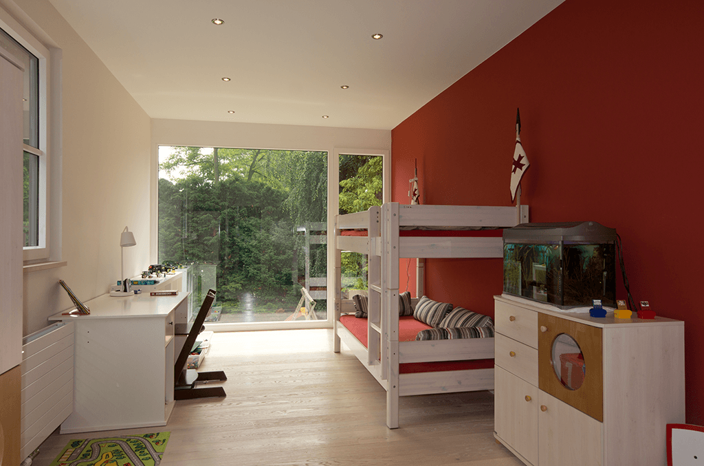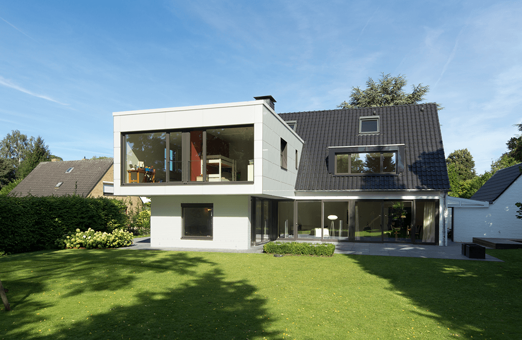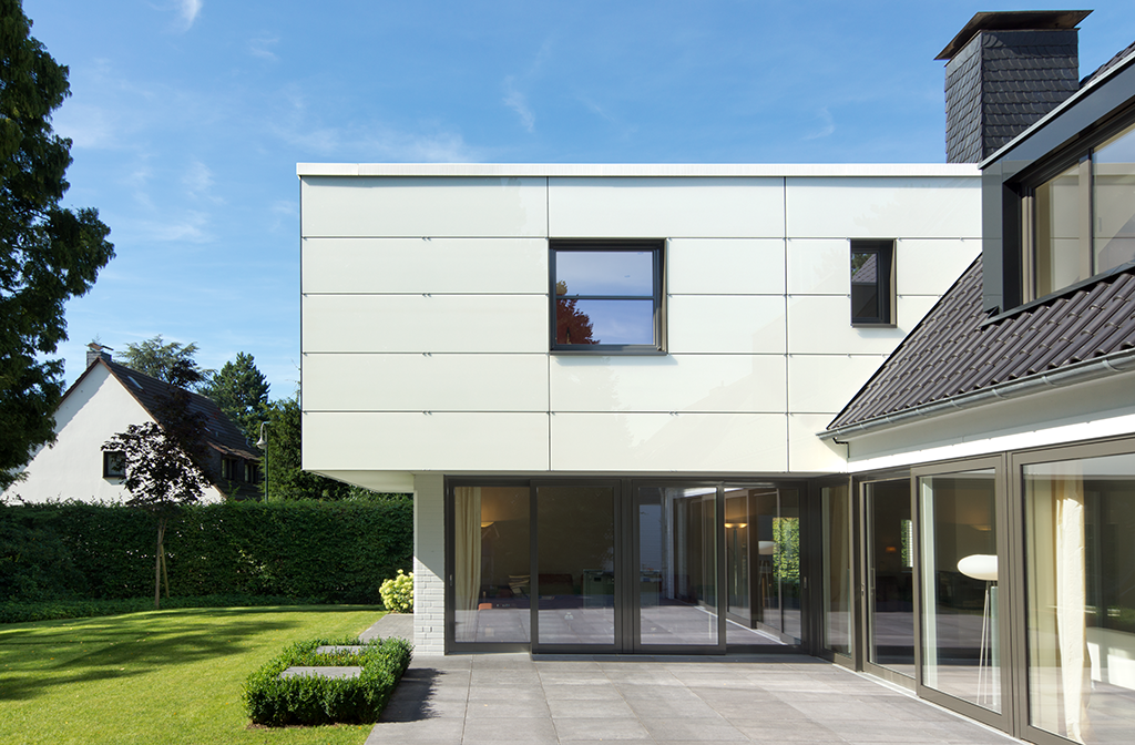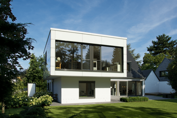 Das Wohnhaus aus den 60er Jahren wurde um einen Wohnbereich und Kinderzimmer erweitert. Auf dem massiven, weißgeschlämmten Sockel ruht ein mit weiß lackierten Glasplatten verkleideter Baukörper.